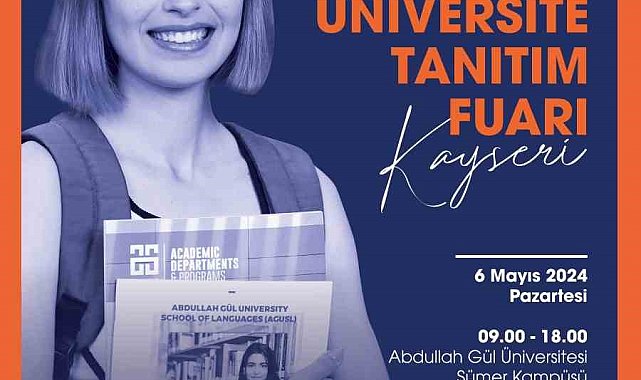Anadolu Üniversiteler Birliği'nin (AÜB) düzenlediği Üniversite Tanıtım Fuarlarının bu yıl ilki, Abdullah Gül Üniversitesi (AGÜ) Sümer Kampüsü'nde yapılacak. Lise öğrencileri, 6 Mayıs Pazartesi günü düzenlenecek fuarda üniversite yaşamı, bölümler ve kariyer olanakları hakkında detaylı bilgiler edinebilecek.