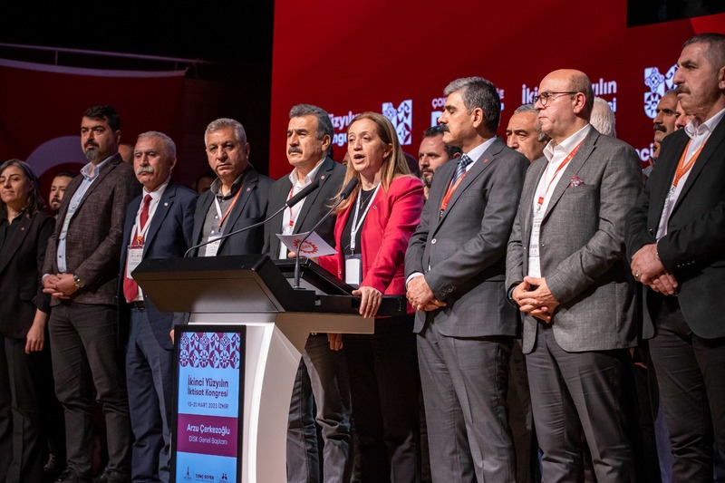 İkinci Yüzyılın İktisat Kongresi’nin “Çokluğa ve Birliğe Davet” temalı son gününde konuşan DİSK Genel Başkanı Arzu Çerkezoğlu, “İkinci Yüzyılda Emek Eksenli Yeniden Kuruluş” başlığı altında sunum yaptı. Arzu Çerkezoğlu, 8 aydır bu çalışmanın sürdüğünü anımsatarak, “Bizim de katkı sunmaya çalıştığımız, Tunç Başkan'ın tüm toplantılara bizzat kendisinin katıldığı ve büyük bir titizlikle yürüttüğü bu çalışma son derece önemli. Bu kongreyi, çok özel bir tarihsel dönemde gerçekleştiriyoruz. 100 yıl önce birinci İktisat Kongresi toplandığında hem dünyada hem de bu topraklarda yeni bir dönemin ilk adımları atılıyordu. Zamanın ruhu denir ya, 100 yıl sonra bugün de hem dünyamız hem de ülkemiz açısından yeni bir çağın eşiğinde bu kongreyi yapıyoruz. Bu sistemin adına ne dersek diyelim; emperyalizm, kapitalizm, neoliberalizm... Nasıl tarif edersek edelim, bu sistemin tüm dünyada ve ülkemizde de işçi sınıfına, kadınlara, emekçilere, gençlere, bütün dünya halklarına vaat edeceği bir şey kalmadı. Bütün masallar bitti, bütün yaldızlar döküldü. Eşitsizliklerin alabildiğine arttığı, iklim değişikliğinden, su krizi, enerji krizi, gıda krizine kadar, sağlığın, eğitimin, sosyal güvenliğin özelleştirilmesinden işsizliğe kadar, bütün yıkıcı sonuçlarını yaşadığımız bu düzen artık iflas etti” dedi.