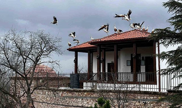 Baharın gelmesiyle güneyden kuzeye göç etmeye başlayan leylekler, Bilecik'teki Şeyh Edebali Türbesi'nde de mola verdi.