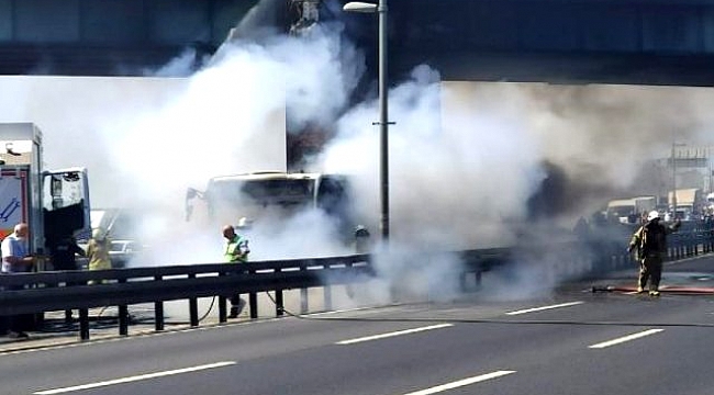 İstanbul Bakırköy'de metrobüste yangın çıktı. İhbar üzerine olay yerine çok sayıda itfaiye ekibi sevk edildi. İncirli metrobüs durağına yakın bir noktadaki yangına ekiplerin müdahalesi sürüyor. Olay yerinden gelen ilk fotoğraflarda metrobüsün alev alev yandığı görülüyor. Metrobüs yangını nedeniyle D-100 Ankara yönü trafiğe kapatıldı. Araçlar yan yola yönlendiriliyor.