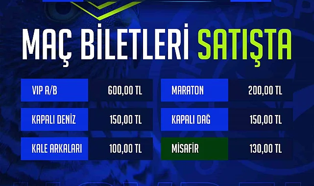 Karşılaşmanın maç biletleri ise satışa çıkarıldığı duyuruldu. Yapılan açıklamada, VIP A/B 600 TL, maraton 200 TL, kapalı deniz 150 TL, kapalı dağ 150 TL, kale arkaları 100 TL iken misafir tribünü ise 130 TL olarak belirlendi.