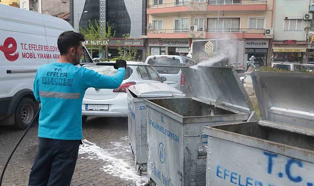 Efeler Belediyesi Temizlik İşleri Müdürlüğü ekipleri, rutin olarak yaptıkları çöp toplama ve çevre temizliği çalışmalarının yanı sıra ilçe genelindeki çöp konteynerlerini de yıkayıp dezenfekte ediyor.