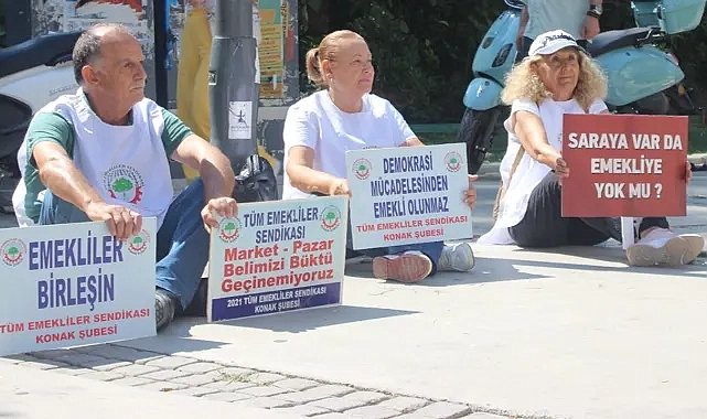 Tüm Emekliler Sendikası izmir Konak Şubesi emekli maaşlarının yetersizliğini protesto etmek için Alsancak’ta oturma eylemi düzenledi. Oturma eylemi öncesi konuşan sendikanın Şube Başkanı Ayşe Ekşioğlu, bugüne kadar birçok eylem yaptıklarını ancak seslerinin duyulmadığını belirtti. Ekşioğlu, “İstediğimiz maaş çok cüzi bir rakam çok büyük bir zam ve maaş beklentimiz yok. Biz seyyanen zam istiyoruz milyonlar beklemiyoruz ve istemiyoruz. Ama bu isteklerimize rağmen bizim sesimizi duymuyorlar. Artık bıçak kemiğe dayandı. Markete, pazara gidemez olduk alışveriş yapmayı unuttuk. Haftada bir gün pazara gitmeye çalışıyoruz ve aldıklarımız 500 lira tutuyor. Her hafta gitsek ayda 2 bin lira. Bizler 7 bin 500 lira ile maaş alıyoruz ve ne peynir ne et alabilme imkanımız var. Bir sosyal yaşantımız da yok. Hangi birini anlatalım?” dedi.