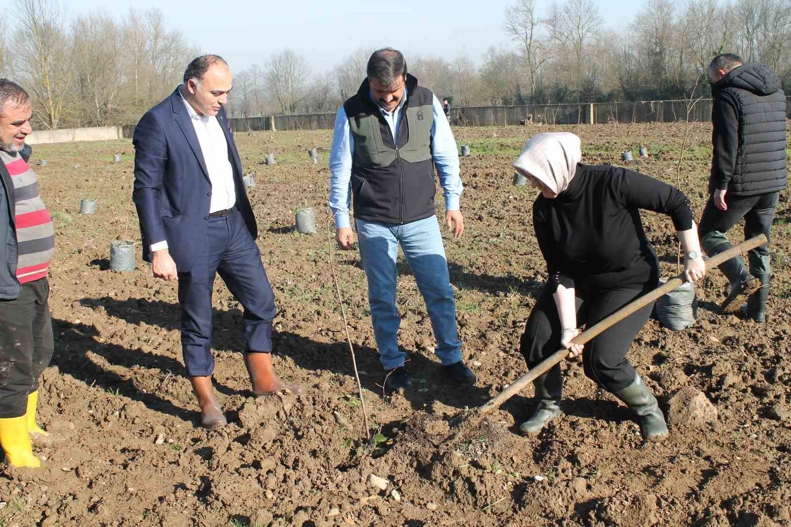 Kurulacak örnek fındık bahçesinde gerçekleşen fındık fidanı dikimine Tarım ve Orman İl Müdürü Esra Uzun, Düzce Üniversitesi Orman Fakültesi DÜFAM Müdürü Doç. Dr. Şemsettin Kulaç, Ticaret Borsası Genel Sekreteri Dursun Kara ve fındık üreticisi Özcan Baylan katıldı.