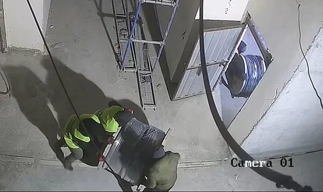 Görüntülerde hırsızların inşaata girip dev kablo rulolarını çaldıkları görülüyor.
