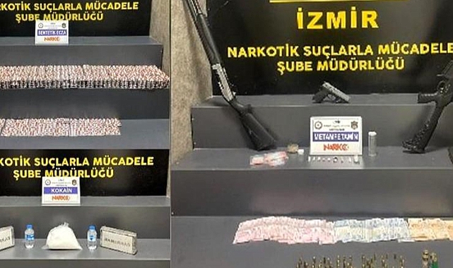 İzmir İl Emniyet Müdürlüğü Narkotik Suçlarla Mücadele Şube Müdürlüğü ekipleri, 19-25 Mart tarihleri arasında il genelinde 69 ayrı operasyon gerçekleştirdi. Adreslerde yapılan aramalarda, 6 kilo 490 gram esrar-skank, 3 kilo 251 gram kokain, 799 gram metamfetamin, 371 gram sentetik kannabinoid (bonzai vb.), 16 bin 528 adet sentetik ecza, çeşitli uyuşturucu türlerinden satışa hazır hale getirilmiş vaziyette bir miktar uyuşturucu madde, 8 adet hassas terazi, 6 adet tabanca, 2 adet tüfek, 86 adet tabanca/tüfek fişeği ve suçtan elden edilen 111 bin 170 Türk Lirası ele geçirildi.