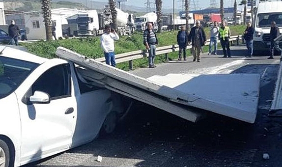 Kaza, dün saat 15.45 sıralarında İzmir-Çanakkale Yolu Biçerova Kavşağı’nda meydana geldi. Edinilen bilgiye göre, Menemen’den Aliağa istikametine giderken trafik ışıklarında bekleyen E.A. idaresindeki 35 GC 3307 plakalı otomobilin üzerine sol tarafında bekleyen O.S. idaresindeki 35 ARR 518 plakalı tırın kasasında yüklü olan panel duvar devrildi. Duvarın otomobilin üst arka kısmına devrilmesi ve otomobilde sürücüden başka kimsenin olmaması facianın önüne geçti.