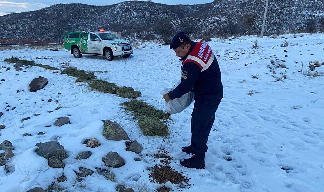 Aksaray'da kış mevsimiyle birlikte sokak ve yaban hayvanlarının beslenmesine yönelik harekete geçen jandarma ekipleri, dağ ve arazilerde hayvanlara yem bırakıyor.