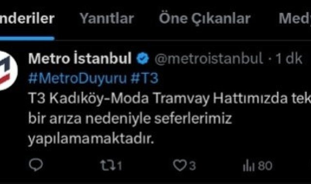 Metro İstanbul Moda Yerleşkesinde çıkan trafo yangını nedeniyle Kadıköy - Moda seferleri bir süreliğine durdu. Metro İstanbul 'X' hesabından yaptığı açıklamada, "T3 Kadıköy -Metro tramvay hattımızda teknik arıza nedeniyle seferlerimiz yapılmamaktadır. Ekiplerin olaya müdahalesi devam etmektedir" denildi.