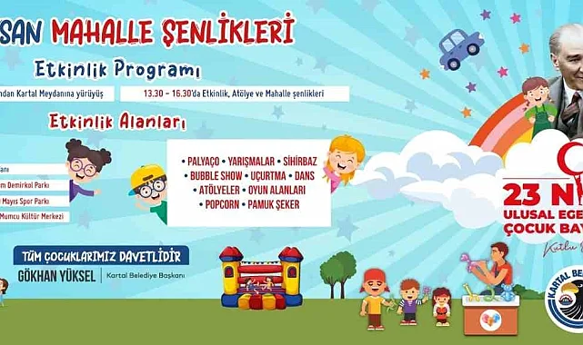 23 Nisan Ulusal Egemenlik ve Çocuk Bayramı etkinlikleri, Kartal Belediyesi tarafından geleneksel hale getirilen kortej yürüyüşü ile başlayacak. Saat 12.00'da Neyzen Tevfik Meydanı'ndan başlayacak olan yürüyüş, Kartal Meydanı'ndaki etkinlik ve atölyelerle devam edecek.Kartal'ın farklı noktalarında yapılacak olan etkinlikler saat 13.30-16.30 saatleri arasında; Kartal Meydanı, Yakacık Mahallesi-Bayram Demirkol Parkı, Karlıktepe Mahallesi-19 Mayıs Spor Parkı ve Uğur Mumcu Mahallesi-Uğur Mumcu Kültür Merkezi'nde yapılacak. Mahalle Şenlikleri'nde; atölye etkinliklerinden palyaço ile sihirbaz gösterilerine, bubble showdan yarışmalara, uçurma-dans etkinliklerinden oyun alanları olmak üzere birçok sürpriz etkinlik Kartallı çocuklar için yapılacak. Çocuklara ayrıca etkinlikler boyunca patlamış mısır ve pamuk şeker ikramında bulunulacak.
