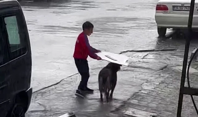 İstanbul'da dün başlayan sağanak yağış, gün boyunca birçok ilçede etkili oldu. Esenyurt'ta sağanak yağış sırasında küçük bir çocuk, adeta insanlık dersi verdi. Yanındaki sokak köpeğinin ıslanmaması için bir tahta parçası kullanan çocuk, cep telefonu kamerasına yansıdı. Kendisi ıslanmasına rağmen tahta parçasını köpeğin üzerine tutan çocuğun görüntüleri yürek ısıttı. O anlar ise bir vatandaşın cep telefonu kamerasına yansıdı.