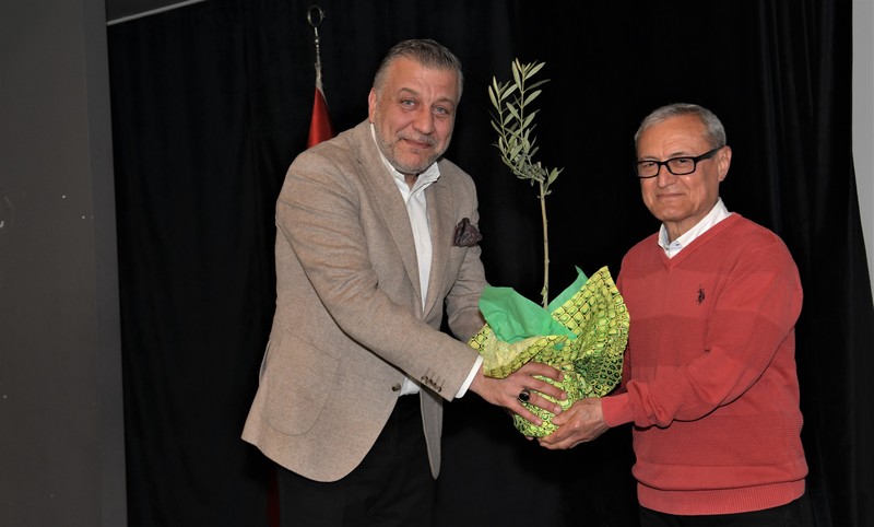 Bornovalılardan yoğun ilgi gören panele katılan Bornova Belediye Başkan Yardımcısı Barbaros Taşer, Prof. Dr. Ali Osman Karababa’ya çiçek vererek teşekkür etti.