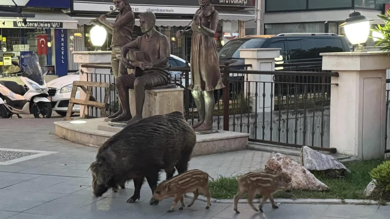 Muğla'nın Marmaris ilçesinde, aç kalan yaban domuzları yiyecek aramak için yerleşim alanına indi.