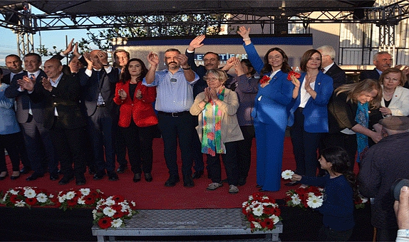 “ÇANKAYA KÖŞKÜ NEYİNİZE YETMEDİ!”Törenin açılış konuşmasını yapan CHP İzmir İl Başkanı Şenol Aslanoğlu, “Sizler saraylara layıksınız ama tarih boyunca saraylar hiç halka hizmet etmemiş. Bizim gözümüz hiçbir zaman saraylarda olmayacak. Bizden, yani halktan yana olanların sarayı hiçbir zaman olmayacak. Biz cumhuriyeti Ankara Keçiören’de Meteoroloji Genel Müdürlüğü binasında iki odalı kömür sobalı binada kurduk. Ancak onlar kendi aileleri, beşli çeteleri için 1100 odalık saray yaptılar, yetmedi Ahlat’ta kışlık saray yaptılar. Onlar büyük bir doğa katliamı yaptırıp Marmaris’te yazlık saray yaptırdılar, sizlerin parasıyla yaptırdılar. ‘Ey milletim, sizler için saray yaptırdık’ dediler, aranızdan biri o sarayda kaldı mı, kalmadı. Koca otluk koyunda yüzmemize izin vermiyorlar, Allah’ın koyunda yüzmemize izin vermiyorlar. Koca Atatürk’e İnönü’ye yeten Çankaya Köşkü neyinize yetmedi! Ama az kaldı, bu sarayları onların elinden alıp halkın eline vermeye sadece 25 gün kaldı. Önce Cumhurbaşkanı Adayı Kemal Kılıçdaroğlu’nu Cumhurbaşkanı yaparak Çankaya Köşkü’ne göndermeye az kaldı” dedi.