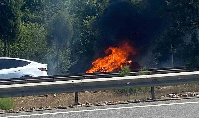 Anadolu Otoyolu Sakarya geçişinde seyir halindeyken yanan otomobil, alev topuna döndü. İtfaiyenin müdahalesiyle söndürülen yangında otomobilden geriye sadece demir yığını kaldı.