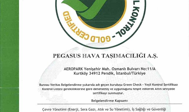 Pegasus Hava Yolları, 'Green Check-Yeşil Kontrol Belgesi'ni en yüksek seviye başarıyı temsil eden altın seviyede almaya hak kazandığını ve hava taşımacılığı alanında, Genel Müdürlük ve Uçuş Hizmetleri kapsamında bu belgeyi alan ilk şirket olduğunu açıkladı.