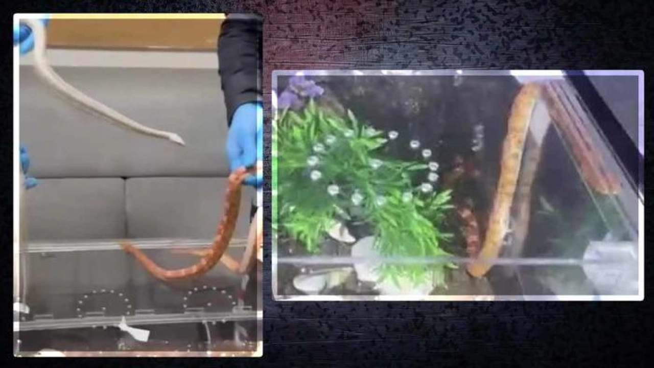 O anlar cep telefonu kamerasına yansıdı. Görüntülerde, cam fanustaki yılanlar polisler tarafından incelemesi ve teslim edilmesi yer alıyor.