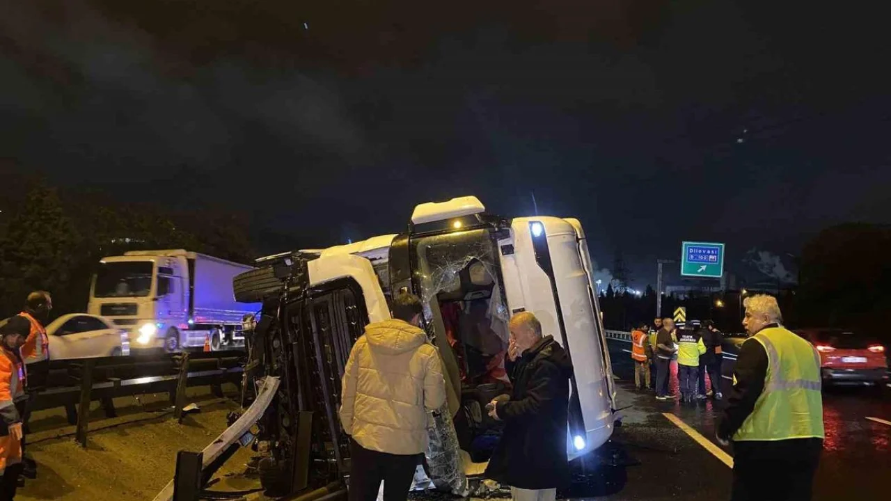 Kaza, gece saatlerinde meydana geldi. Tamer C. yönetimindeki granül yüklü tır, otoyolun Dilovası geçişi İstanbul istikameti Dilovası rampası mevkiinde sürücüsünün direksiyon hakimiyetini kaybetmesiyle kontrolden çıkarak devrildi. İhbar üzerine kaza yerine jandarma, itfaiye ve sağlık ekipleri sevk edildi. Kazada yaralanan sürücü, sağlık ekiplerinin olay yerindeki ilk müdahalesinin ardından ambulansla Fatih Devlet Hastanesi’ne kaldırıldı. Tırın kasasından yola savrulan granül nedeniyle otoyolun her iki yönünde de trafik kontrollü olarak sağlandı. Kazayla ilgili inceleme başlatıldı.