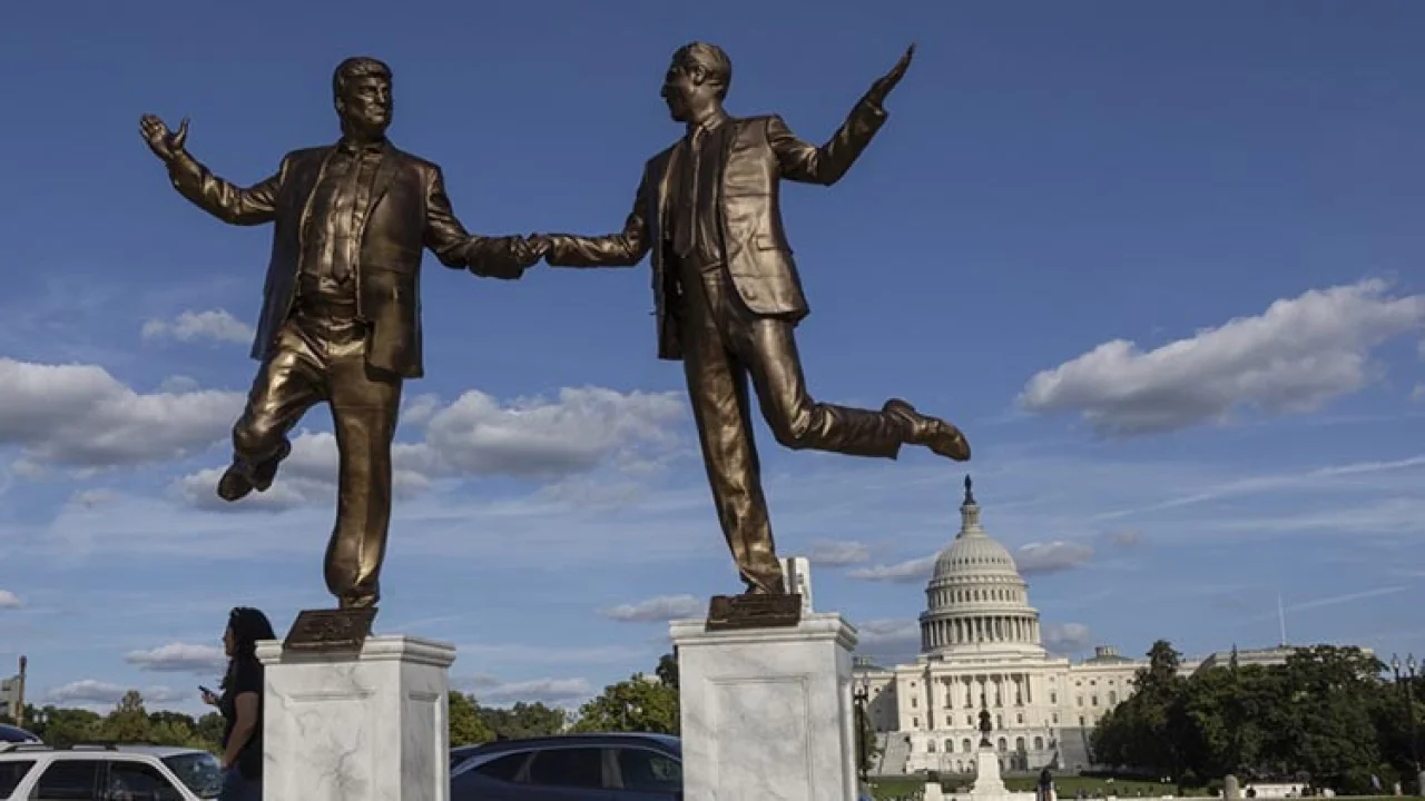 ABD'de Başkan Donald Trump ile reşit olmayan kız çocuklarına yönelik fuhuş ağı oluşturduğu iddiasıyla yargılanırken hapishanede ölü bulunan milyarder Jeffrey Epstein'ı ele ele tasvir eden heykel, daha önce kaldırıldığı Kongre binası önüne yeniden yerleştirildi.
