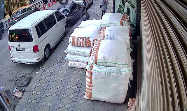 Zeytinburnu'nda 1. kattaki dairenin balkonunda bulunan 5 otomobil lastiği kaldırımda yürüyen kadının yanına düştü. Kadın lastiklerin altında kalmaktan son anda kurtulurken, o anlar kameraya yansıdı.