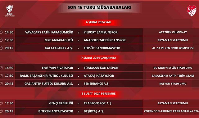 Türkiye Futbol Federasyonu, Ziraat Türkiye Kupası Son 16 Turu'nun programını duyurdu. TFF'nin resmi internet sitesinden yapılan açıklamaya göre Türkiye Kupası'nda son 16 turu karşılaşma programı şu şekilde: